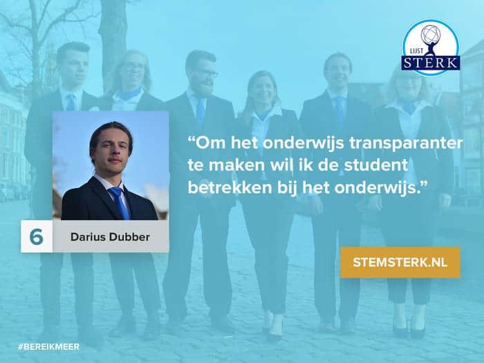 Ik ben Douwe, 20 jaar oud en dit jaar vertegenwoordig ik een plekje in de fractie van Lijst STERK. Ik zit in mijn vierde jaar van de opleiding built environment, maar zoals het bij meerderen gaat doe ik voornamelijk nog vakken van jaar twee en drie. Vorig jaar mocht ik de rol als secretaris en intern coördinator vervullen bij onze studievereniging en zodra je begint met organiseren, dan komt daar geen einde meer aan. Vandaar dat ik ook in de medezeggenschap ben gerold. Ik vind het super leuk om de stem van de student te vertegenwoordigen in de raad. Ik kijk uit naar komend jaar!